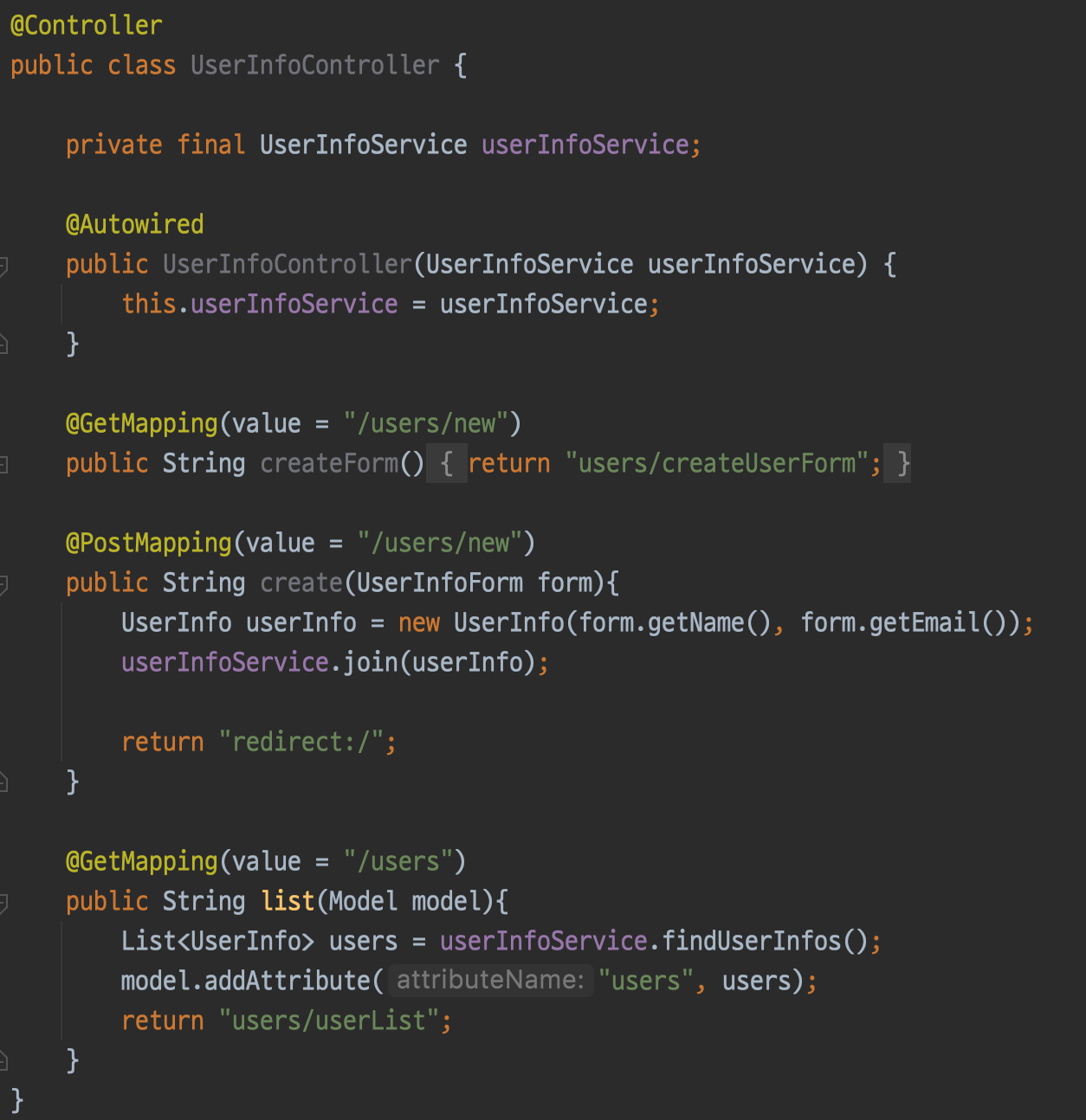 Service에서 구현한 기능들을 controller에서 mapping으로 받은 각각의 경우에 알맞게 사용해 주면 됩니다. 여기서 contorller를 생성시 @Autowired어노테이션을(의존성 주입, DI -> Dependency Injections) 사용하면 스프링이 연관된 객체를 스프링 컨테이너에서 찾아서 넣어줍니다.