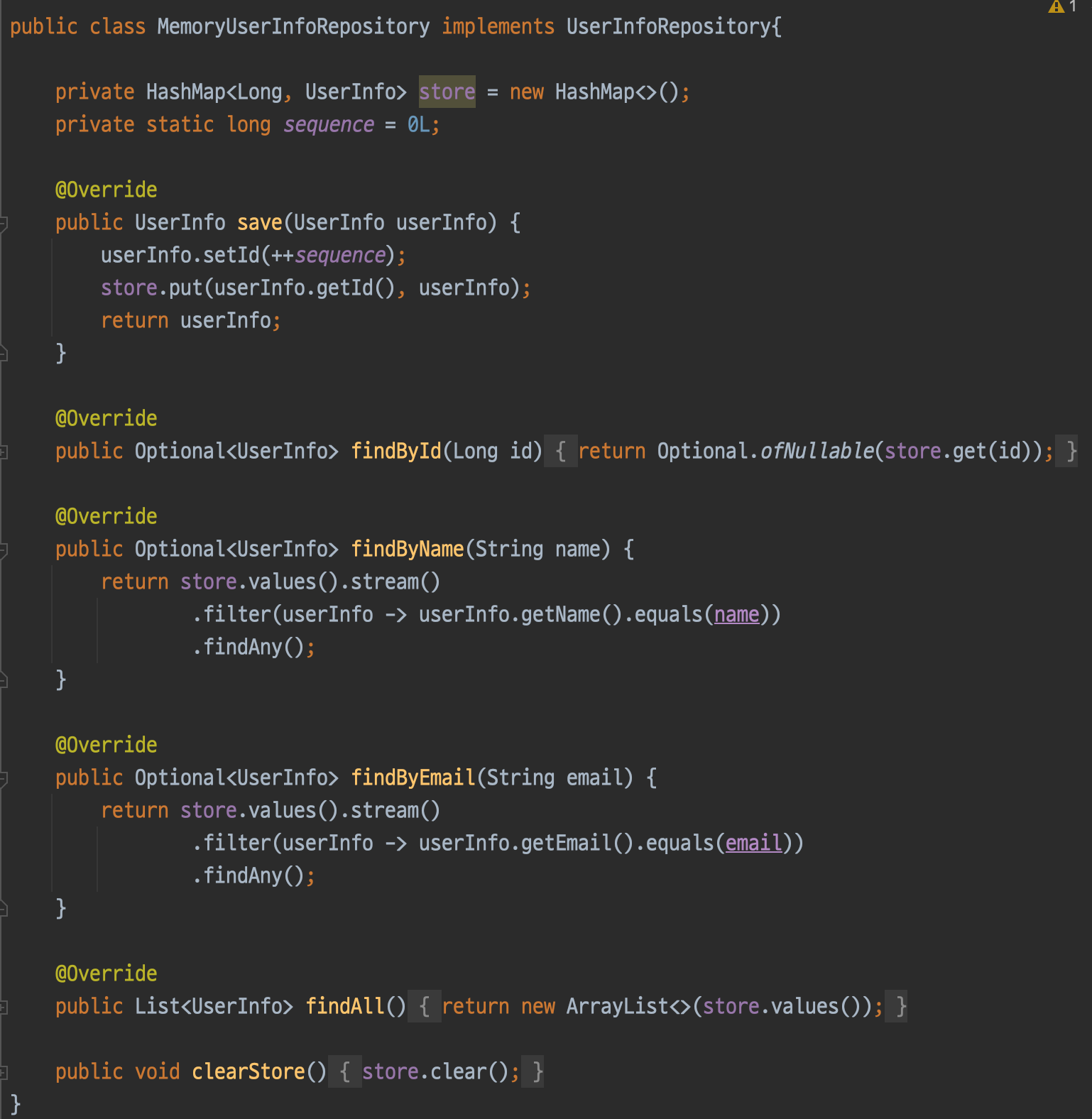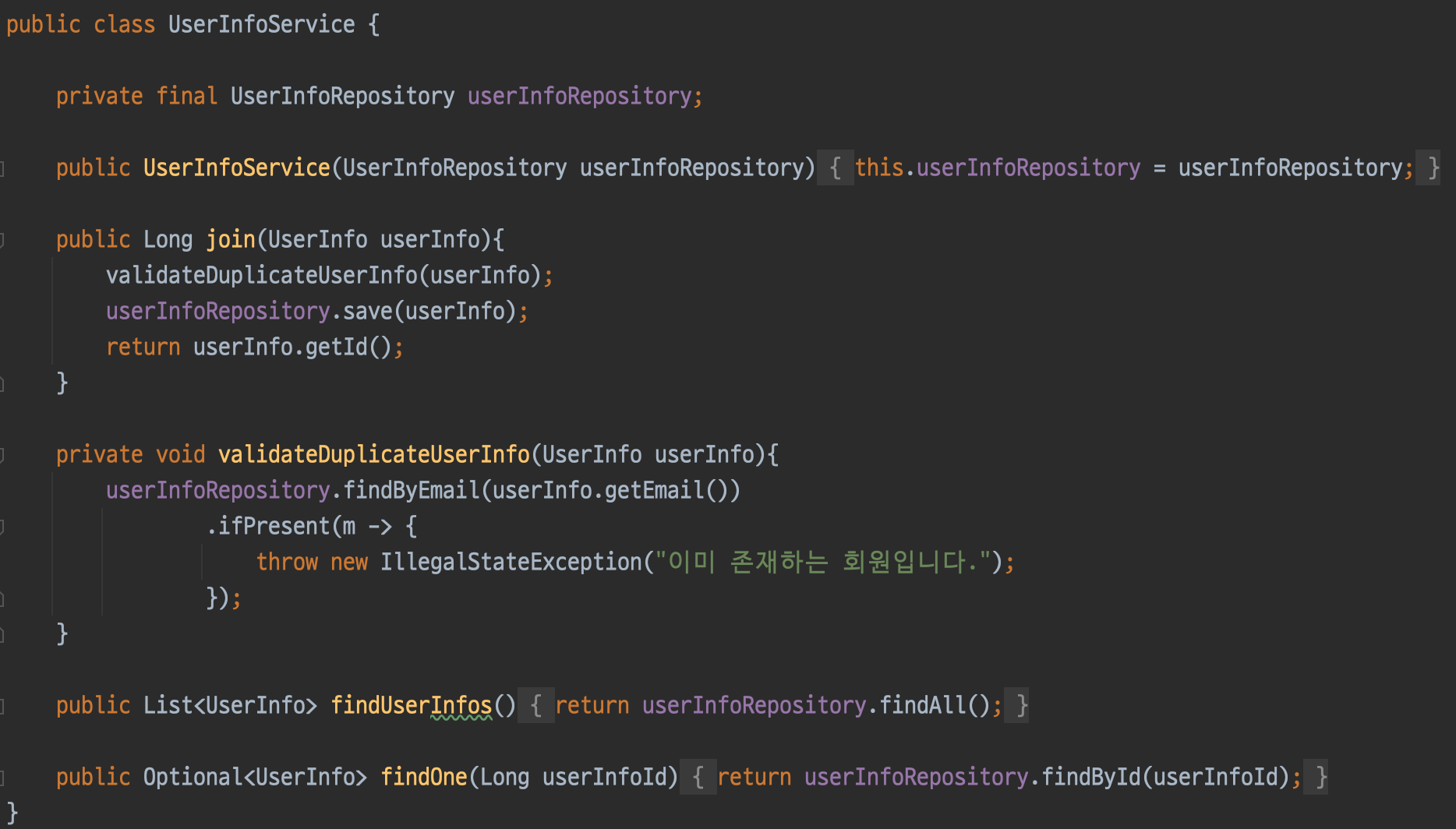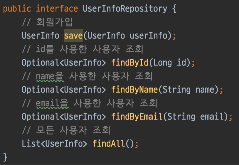 implements를 사용하여 전에 구현해 놓은 UserInfoRepository안에 있는 메서드들을 구현합니다.