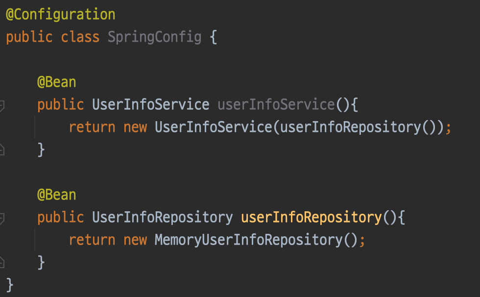 각각 @Service, @Repository 어노테이션을 통해서 Bean에 등록이 가능하지만 본 프로젝트에서는 repository를 여러번 변경할 예정이라서 자바 코드로 직접 등록하여 관리해 줄 예정입니다.
