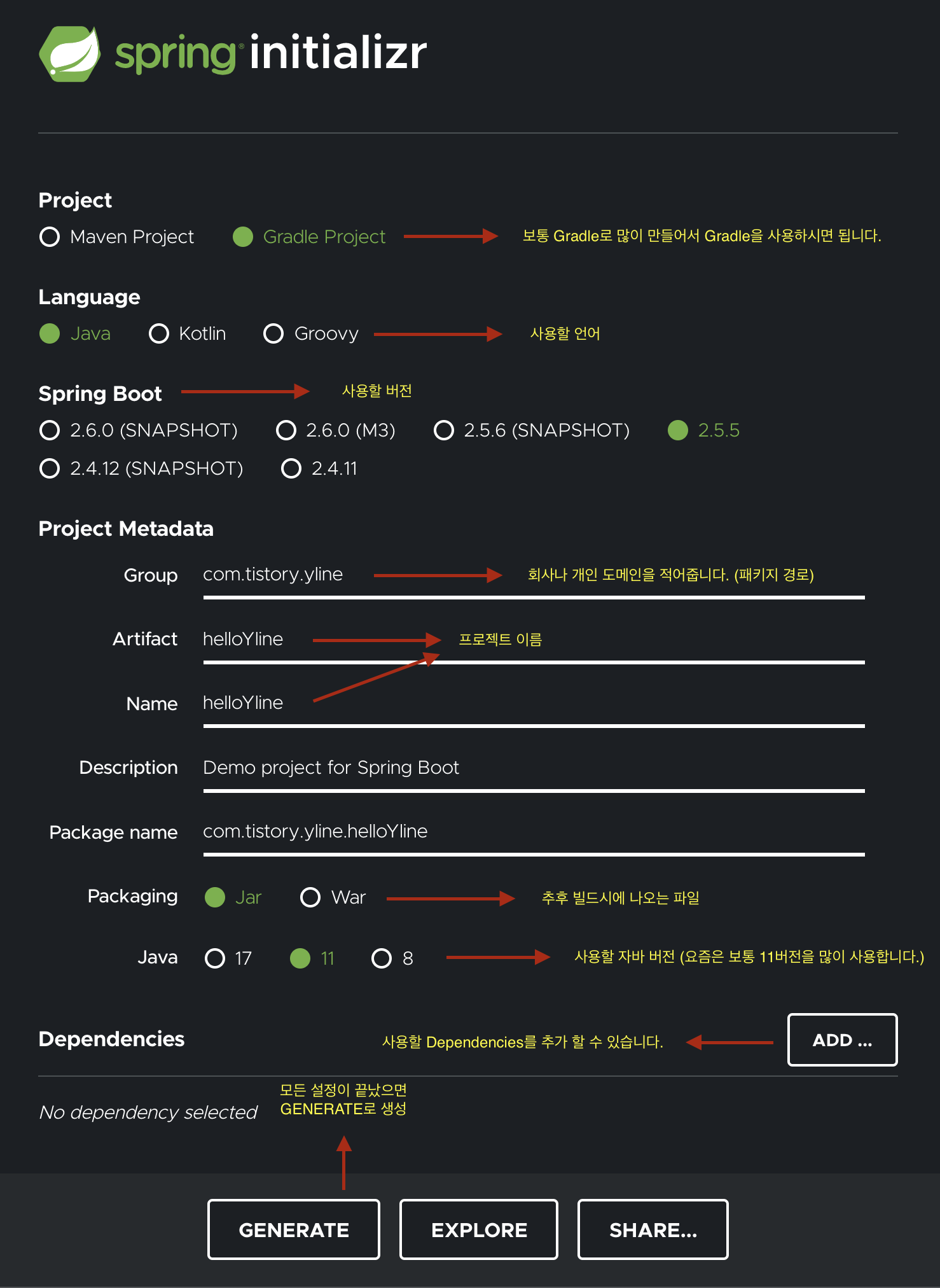https://start.spring.io/ 에 들어가서 사용할 각종 설정을 진행해 주고 GENERATE버튼을 눌러서 파일을 받아줍니다.