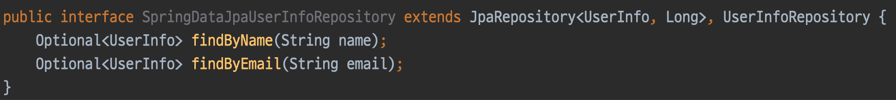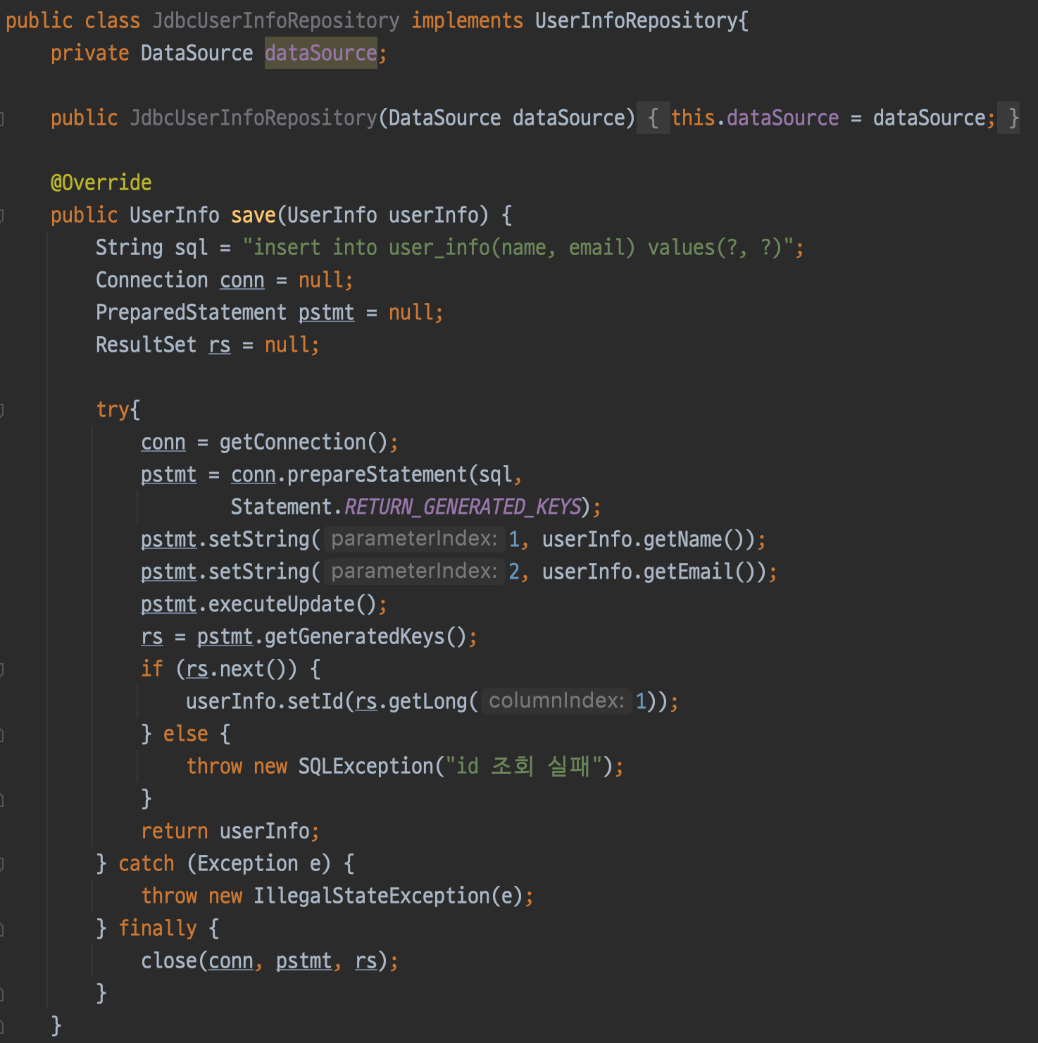 위 사진에서는 가입을 하는 부분과 db연결, db close 해 주는 부분만 보여드렸는데 벌써부터 코드가 너무 길다고 느껴지네요. (실제 전체 코드에서는 UserInfoRepository인터페이스에 있는 모든 기능을 구현해놨습니다.)