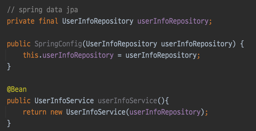 이렇게 repository를 인터페이스로 구현하면 위와 같이 간단한 코드 수정 만으로 db에 접근하는 repository를 구현할 수 있습니다.