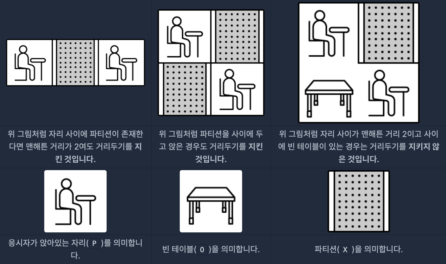아래와 같은 규칙으로 대기실에 거리를 두고 앉도록 안내하고 있습니다.