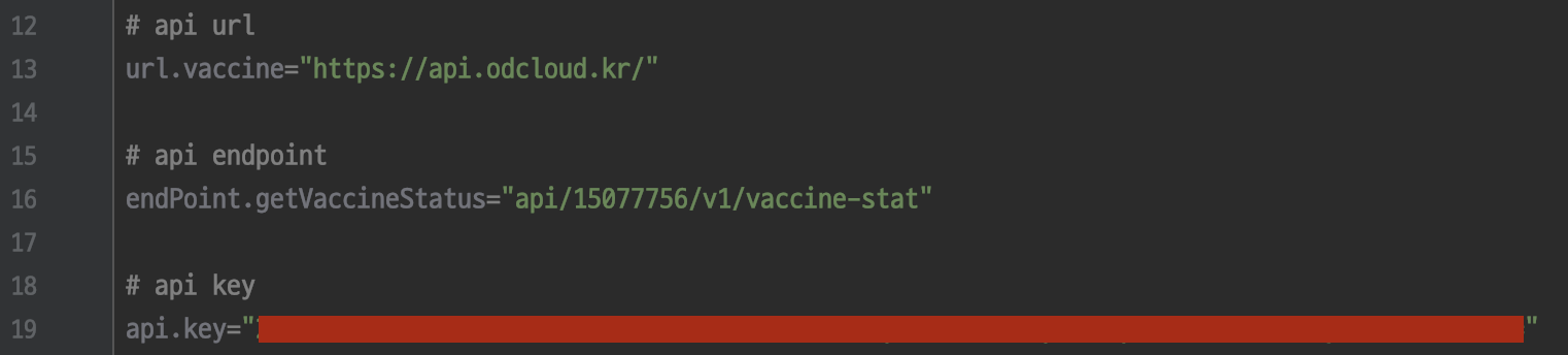 저는 코드에서 사용할 이름으로 URL_VACCINE, ENDPOINT_GET_VACCINE_STATUS, API_KEY 3가지를 android > defaultConfig에 아래와 같이 추가해줬습니다.