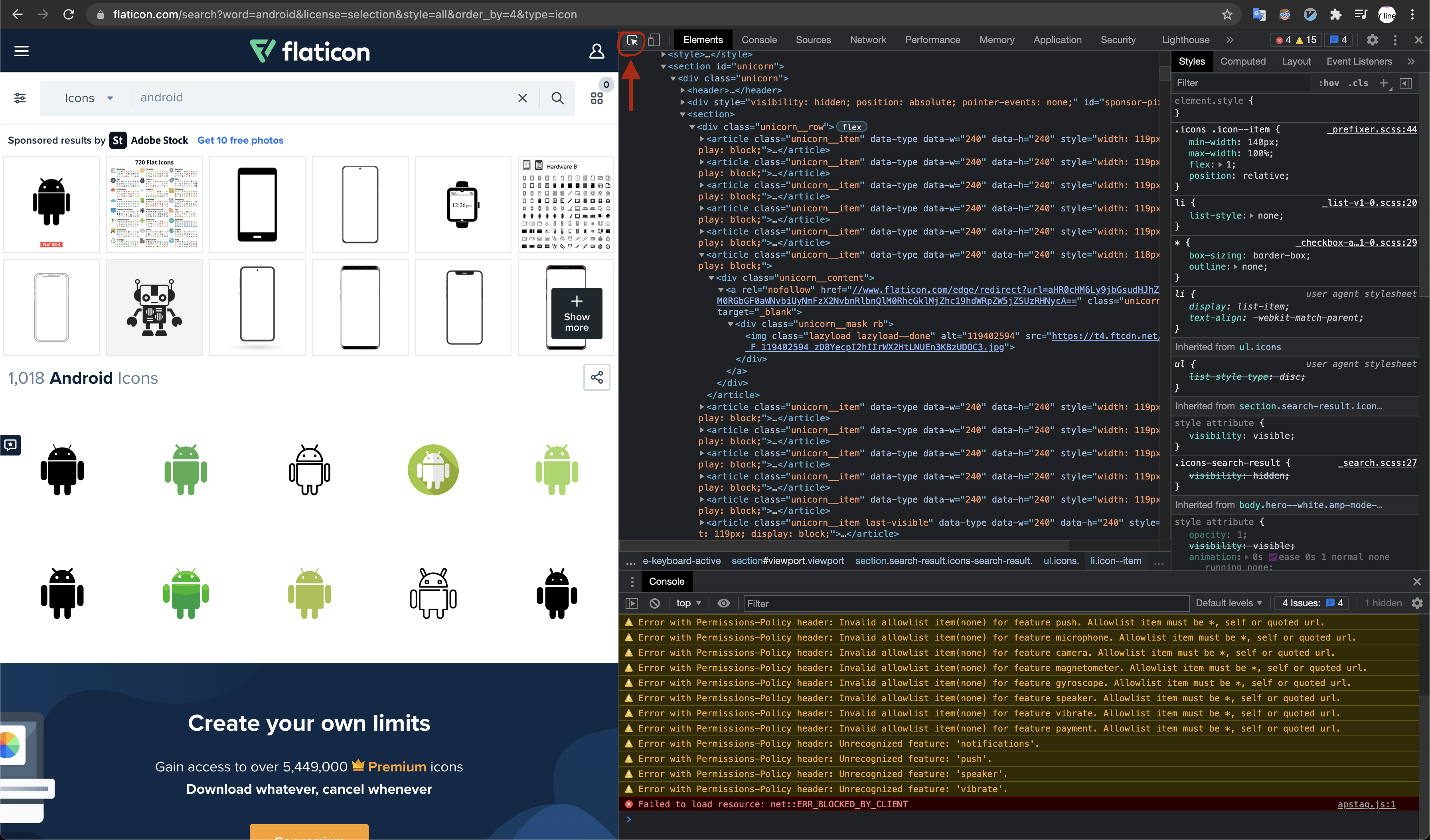 저희는 아이콘을 크롤링할 예정이니 아이콘을 선택합니다. 그럼 모든 icon들을 포함하고 있는 element는 section태그의 class 가 "search-result icons-search-result"인 항목입니다. 보통 웹에서 클래스를 '.'으로 id를 '#'으로 표현한다는 점을 사용하면 아래 콘솔을 통해 쉽게 찾을 수 있습니다. 예를 들어 저희가 선택한 section태그를 id로 찾아보겠습니다.